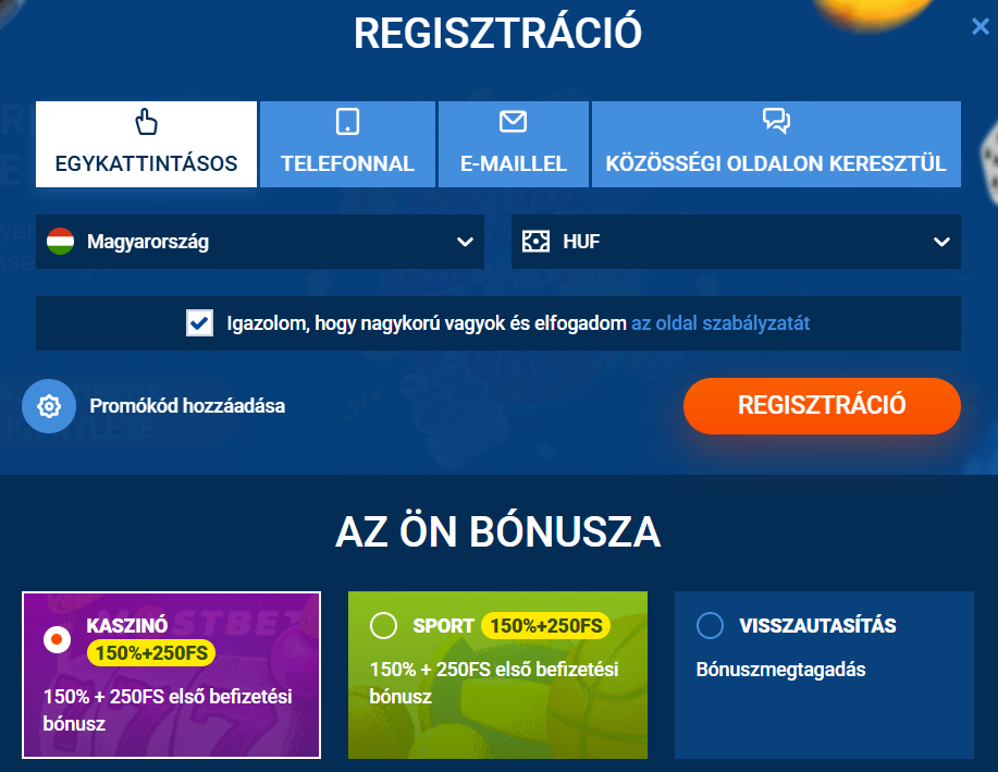 | Regisztrációs | x20 | 10 000 HUF | 5 nap | Kaszinó + sportmix |