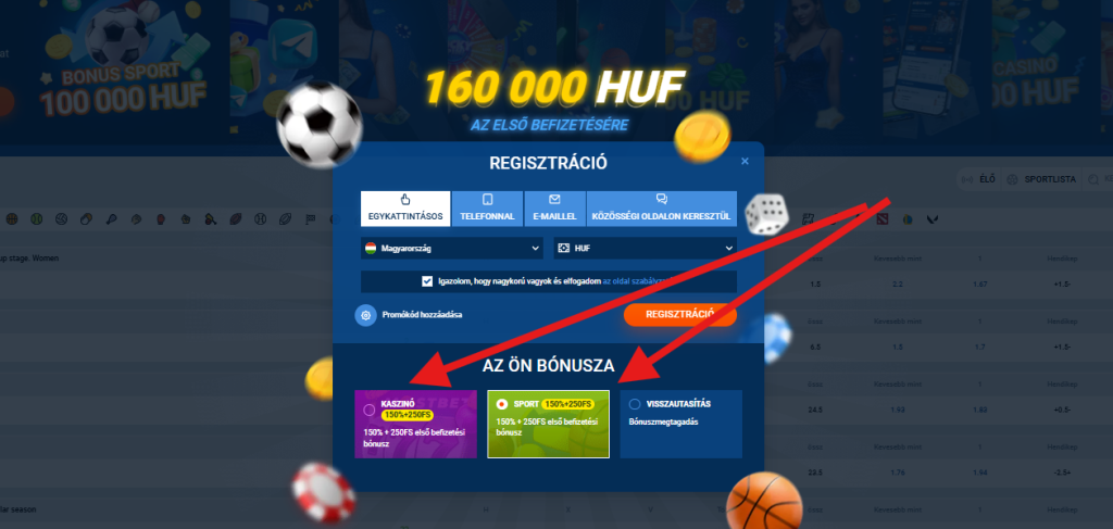 - Az első befizetés alkalmával kiválasztja a bónusztípust — Sport vagy Kaszinó.